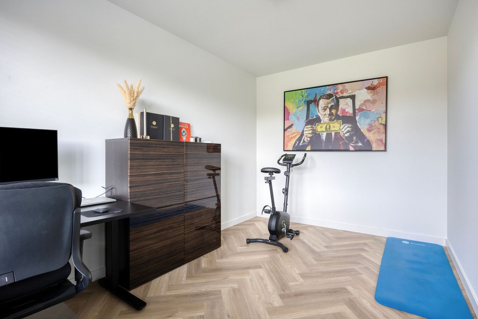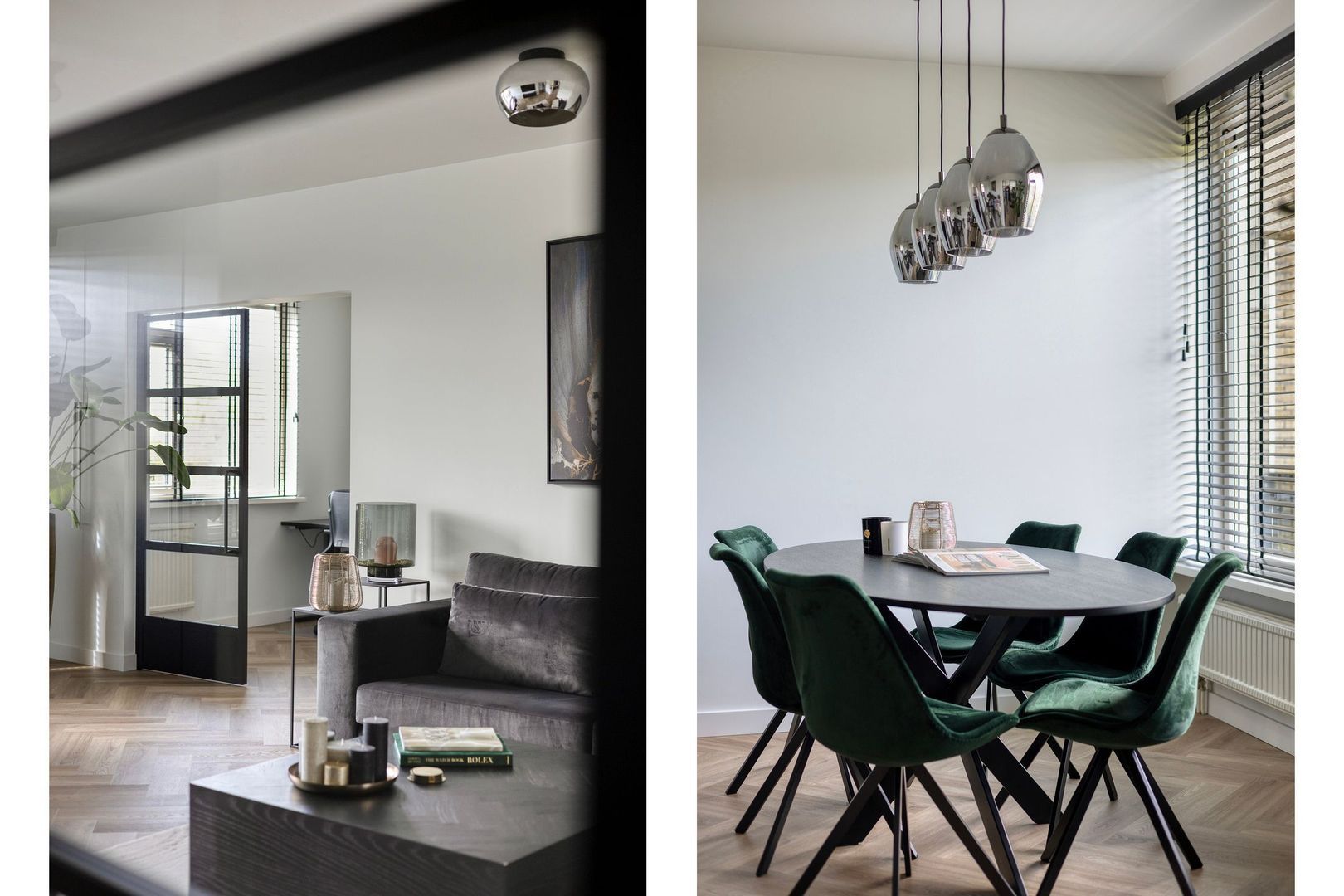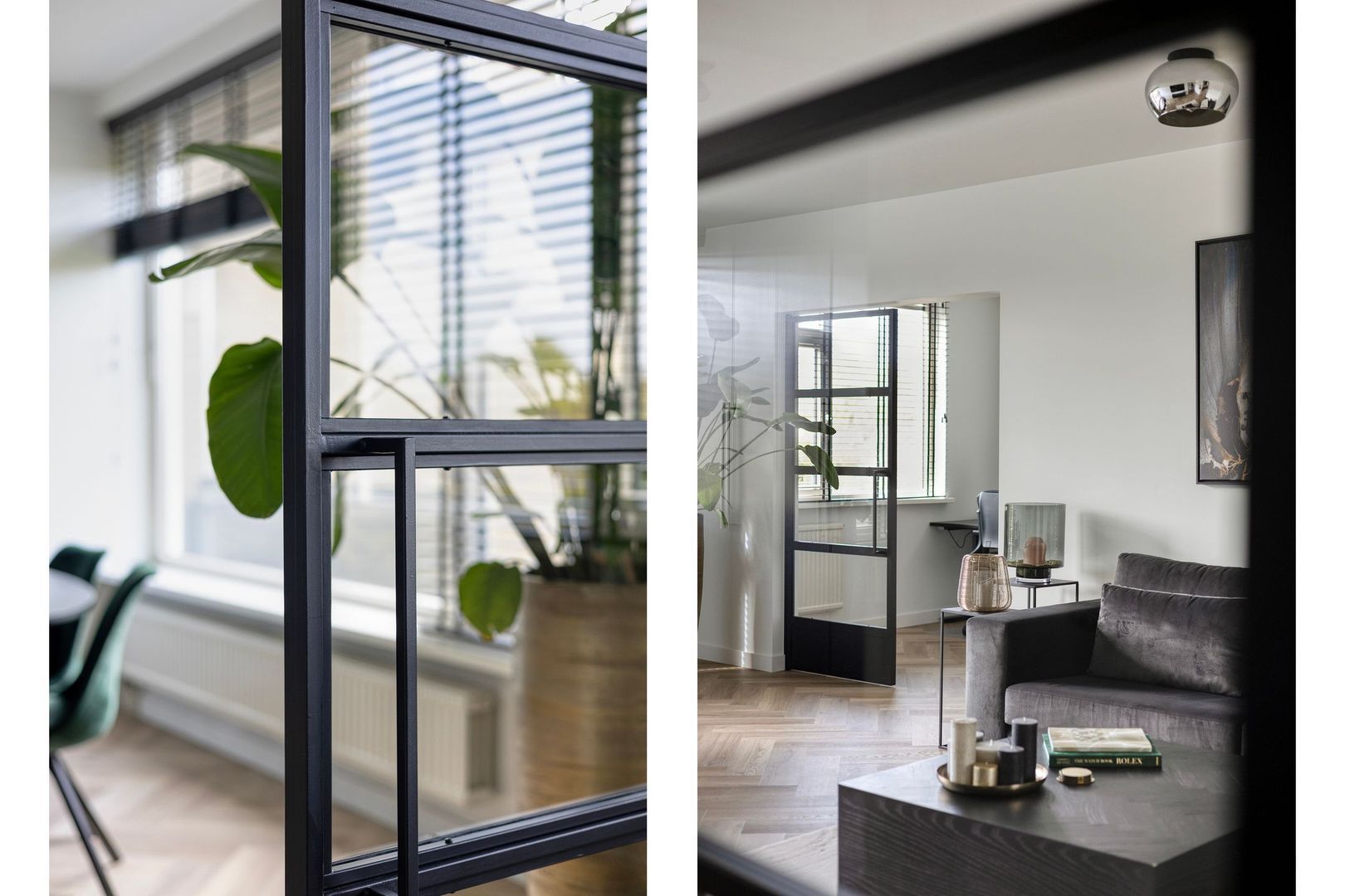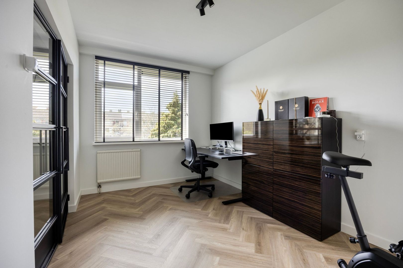 De sfeervolle woonkamer staat in open verbinding met de keuken en is gelegen aan de achterzijde van de woning. Vanuit de woonkamer is er via twee openslaande stalen deuren toegang tot een extra kamer, momenteel in gebruik als werkkamer.