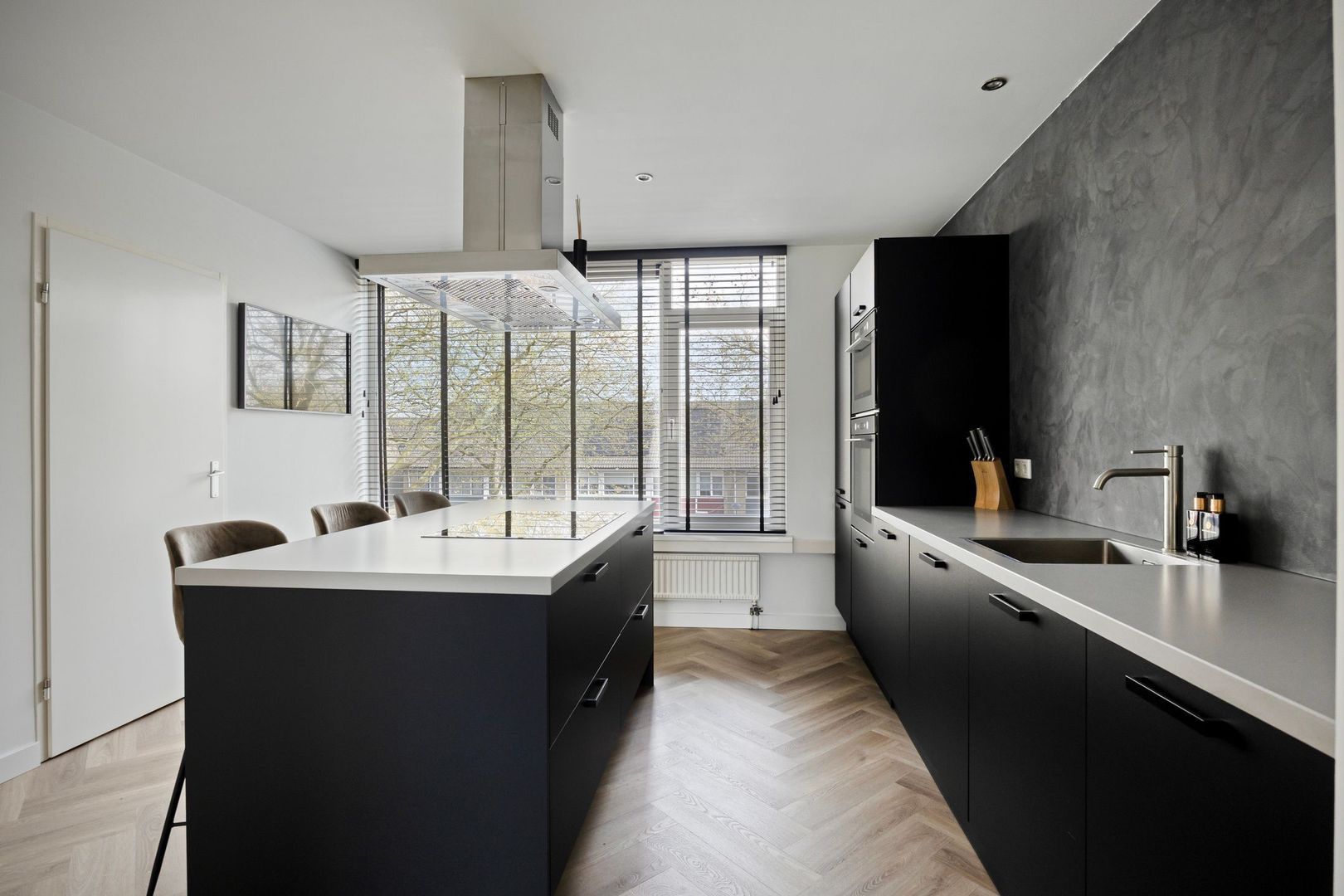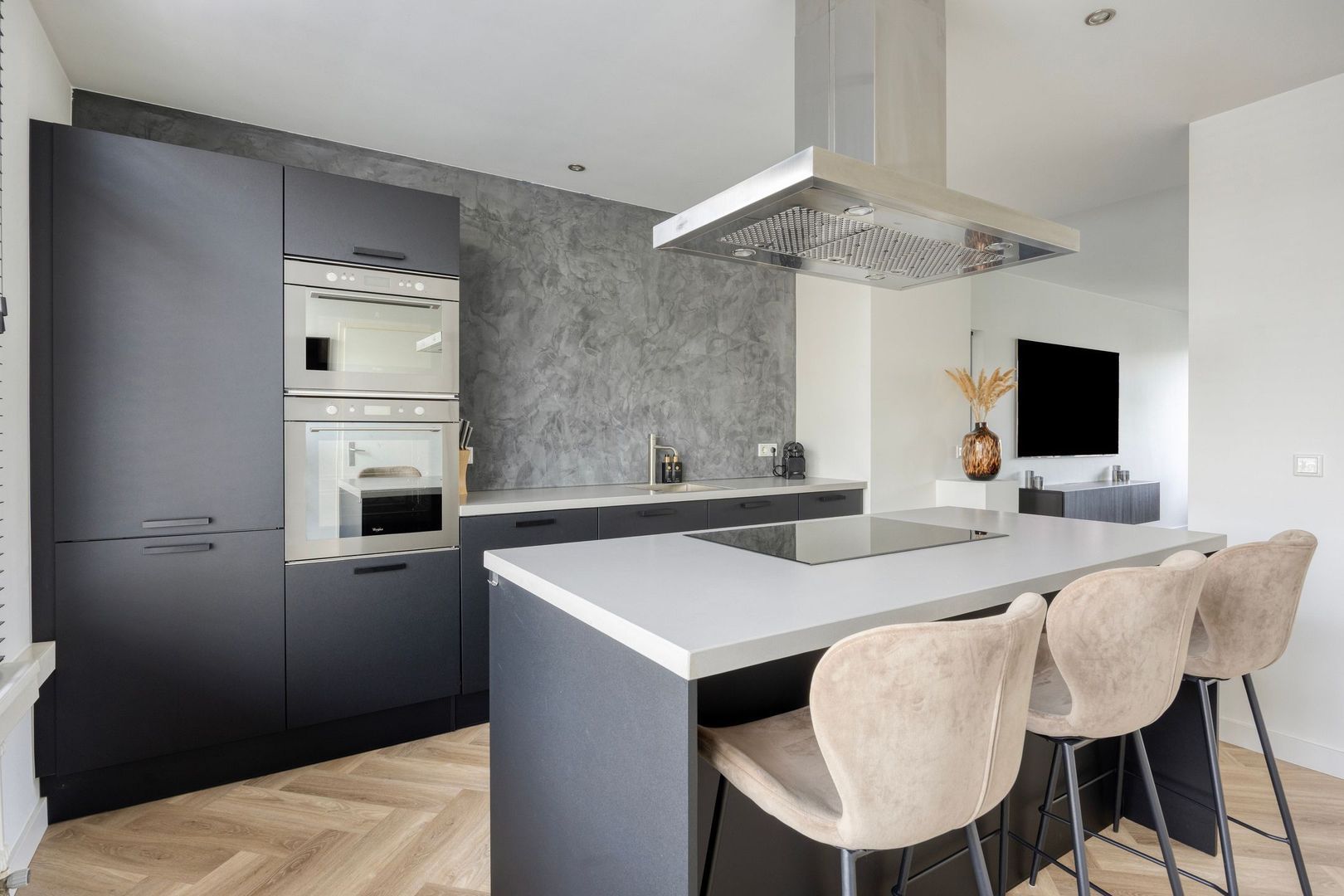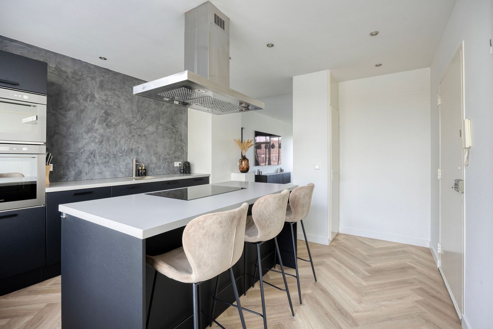 Bij binnenkomst stap je direct de moderne leefkeuken in. De keuken is voorzien van een kookeiland met bar en diverse inbouwapparatuur, waaronder een inductiekookplaat, afzuigkap, vaatwasser, oven, combi-oven en een koel-/vriescombinatie.