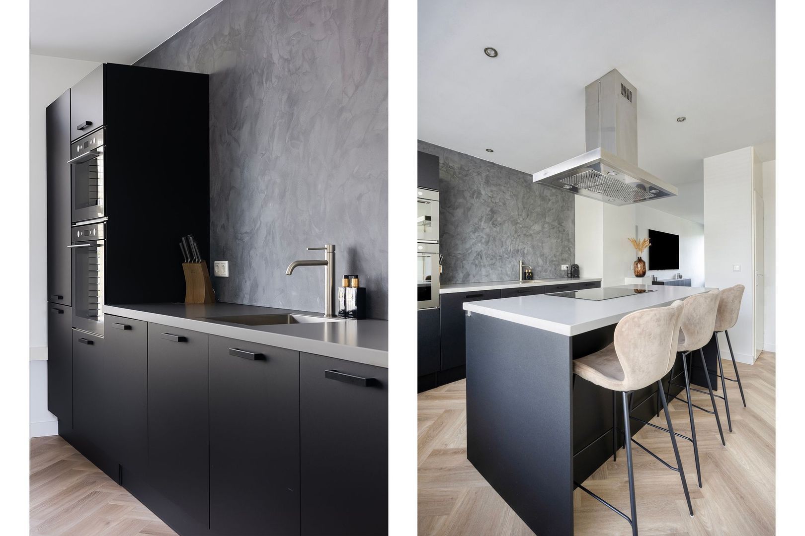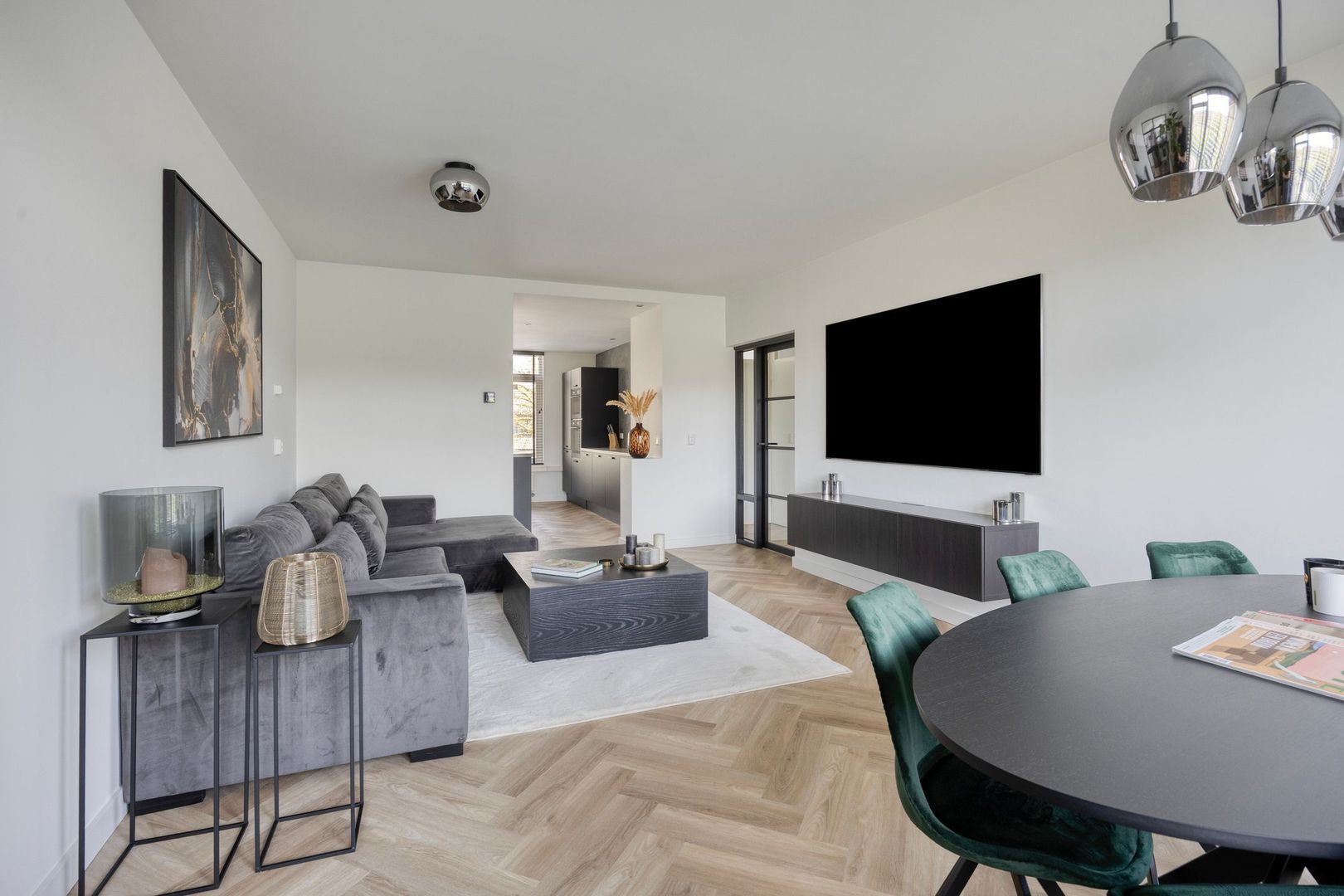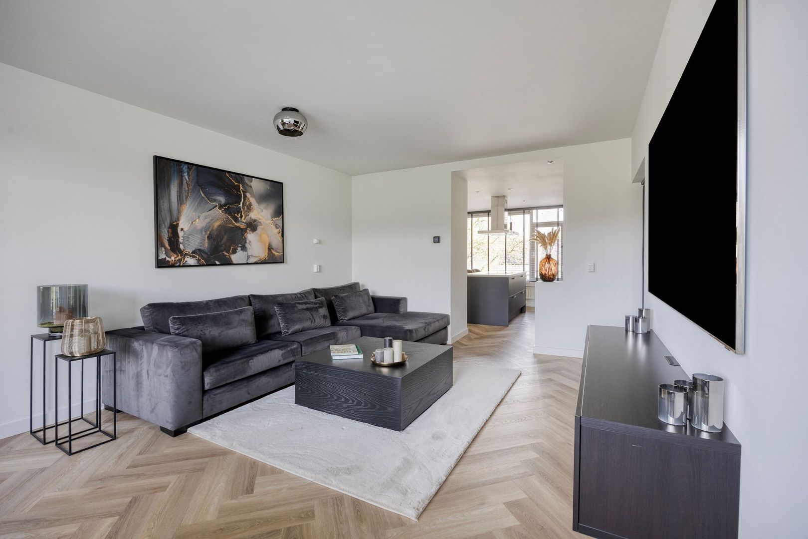 Bij binnenkomst stap je direct de moderne leefkeuken in. De keuken is voorzien van een kookeiland met bar en diverse inbouwapparatuur, waaronder een inductiekookplaat, afzuigkap, vaatwasser, oven, combi-oven en een koel-/vriescombinatie.