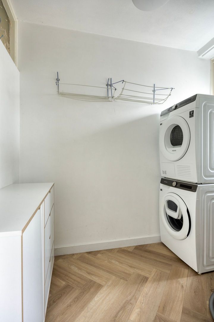 Aangrenzend bevindt zich de praktische bijkeuken met veel bergruimte, aansluitingen voor de wasmachine en droger, en de opstelplaats van de cv-ketel.
