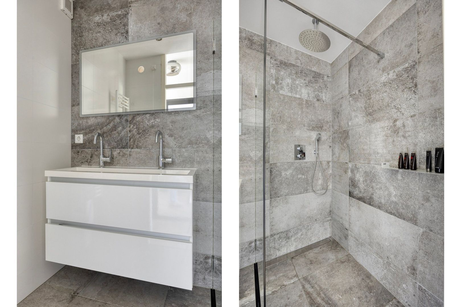 De moderne badkamer is voorzien van een douche, dubbele wastafel en een designradiator.